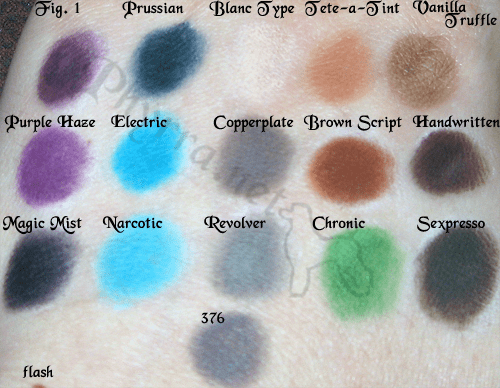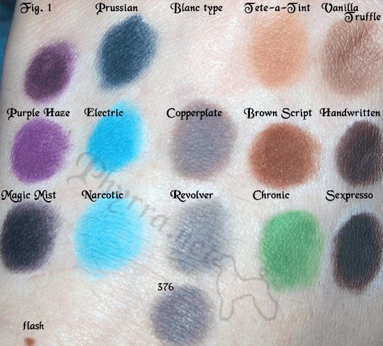 I also included swatches of Sugarpill’s pressed colors, since they’re matte or semi-pearly and they got me back into using pressed shadows. As you can tell, they’re bright, opaque shades. Love + and Dollipop tend to stain the skin a bit, but I believe that they were being reformulated (or already have been).