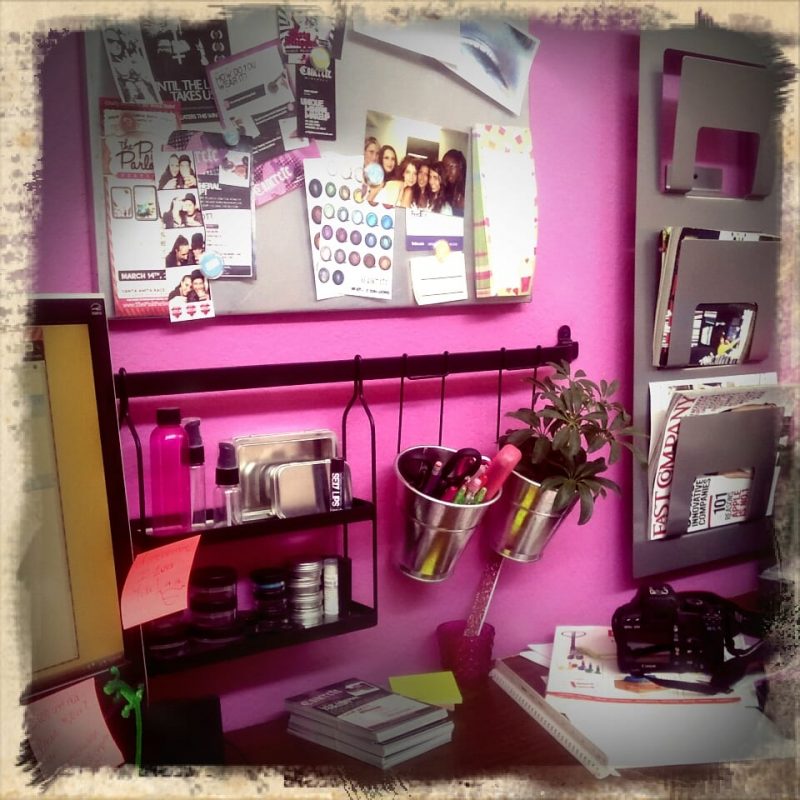 Clean! I actually just went through everything on my desk today. I’m incredibly organized, so everything here has its own place. The wall in front of my desk is bright pink, and I have a ton of packaging samples and inspirational things (like my hot pink sequined Minnie Mouse ears!) nearby. We have a massive wall of products in bins, it looks like a candy store when you walk in!