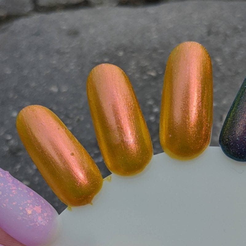 A pale, violet-purple base is boldly accented with a shimmer that shifts in a rainbow of hues. In the shade, see pops of pink, copper, gold, lime, blue and indigo. In brighter lighting, the gold and greens shine through. Extreme angles reveal a pop of deep purple. This multichrome shimmer is best in 2 coats.