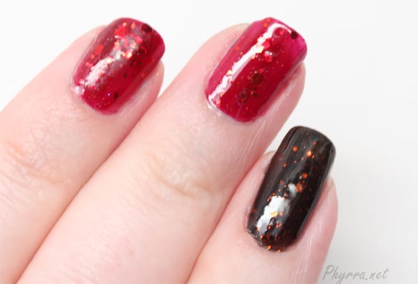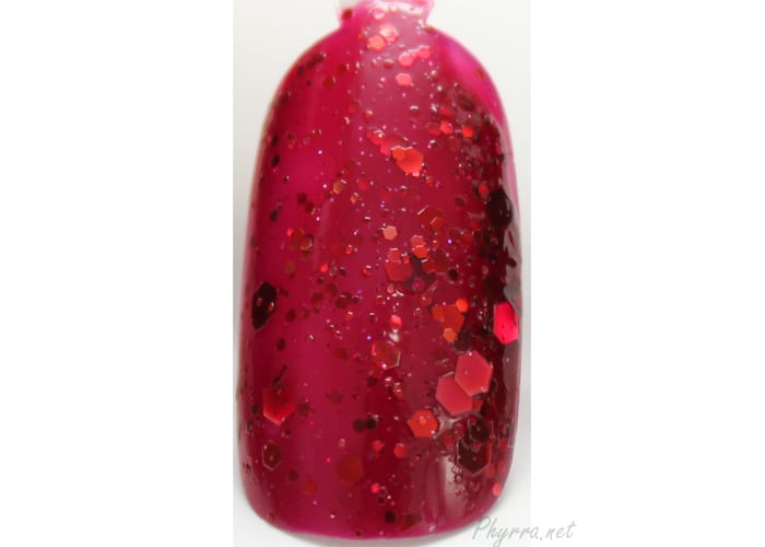 I don’t wear red much. It has to be an AMAZING, eye catching red for me to wear it. This one is amazing. The red, orange and gold glitters really look stunning suspended in the red jelly.