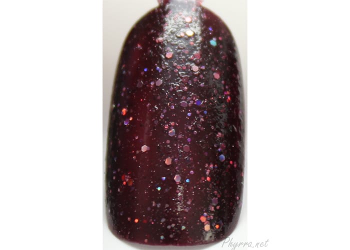 A deep cabernet red jelly is the backdrop for glitters in red, orange and gold. A scattering of holographic glitters gives this fall themed polish sparkle and shine, perfect in 2-3 coats.