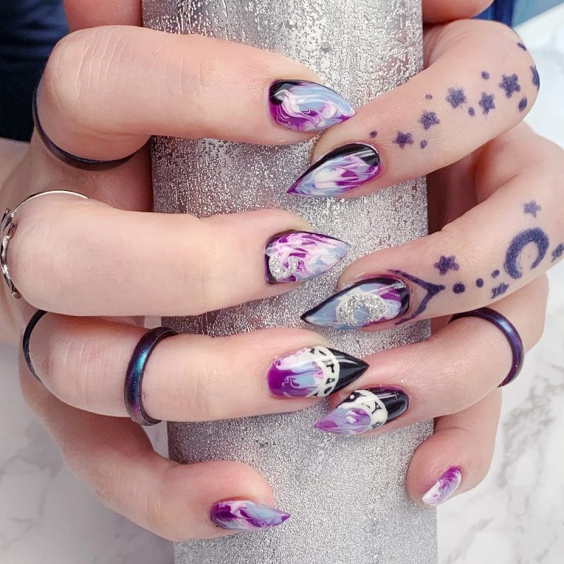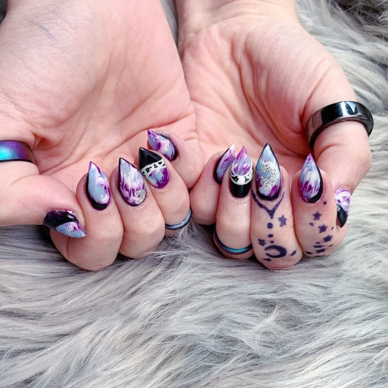 Today I’m sharing my Kiara Sky Gel Nail Polish Manicure with you. As you all know, I love getting my nails done. I currently get hard gel nail fills, similar to acrylic but I don’t experience lifting or any issues with hard gel like I did with acrylic. Lately I’ve been letting Diamond, the talented lady who does my nails, create custom witchy goth gel nail polish manicures for me. She does an amazing job!