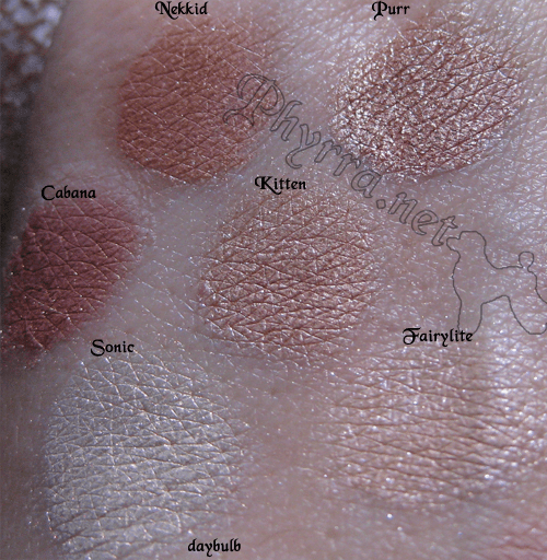 Now to talk about color clones. Kitten and Purr look very close, Purr might be slightly deeper. Nekkid is in the same color family but definitely darker than Kitten and Purr. Nekkid is basically MAC’s answer to Kitten. Cabana is darker than Nekkid and more peach. Sonic is a great highlighter and Fairylite is a favorite of mine for a wash of color all over or a transitional shadow as it has slight pink interference.