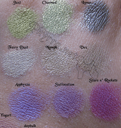 Juxt is a tad deeper and has less shimmer than Charmed. They are very very close. Lunar was included because I find it pretty, same with Fairy Dust. Fairy Dust is really unique to me since it is the palest green with opalescent shimmer. Nymph and Vex are very close, though the pink shimmer appears to be slightly stronger in Vex.