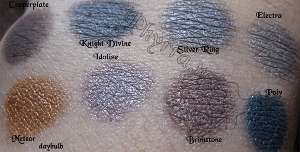 Meteor is lovely, but you all know I love gold/bronze shades. Idolize seems to be a bit more brown than the MAC shade, though I no longer own the MAC shade to swatch it side by side. Brimstone is really nice with Idolize. Poly is breathtaking. I can see why MAC Parrot goes for such a steep price on ebay. Poly has a deep blue base with teal-blue shimmer on top.