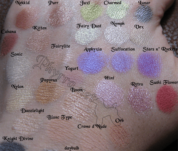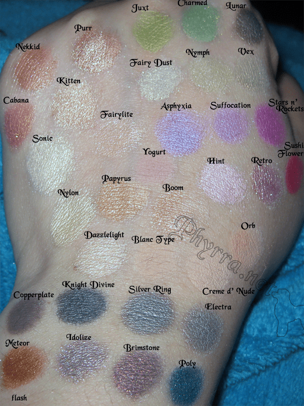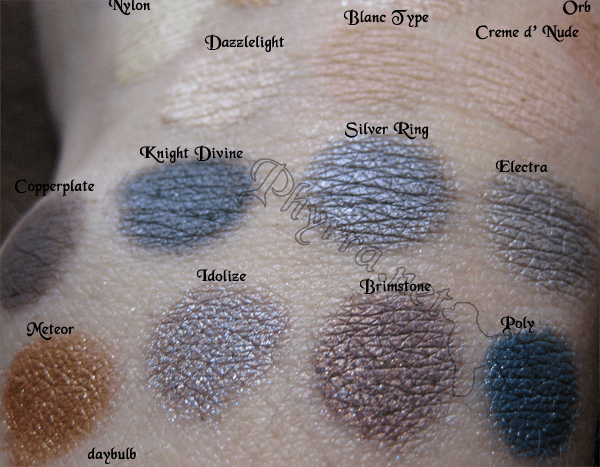 I was talking on twitter with Sparklecrack Central about some MAC comparisons to Indie Shadows, so I ended up swatching a bunch of stuff. Most of the indie stuff is from Silk Naturals. One is from Evil Shades and others are from Stars Makeup Haven (linked to All Cosmetics Wholesale, who has good customer service in my experience). So these swatches are for LiAnn 🙂