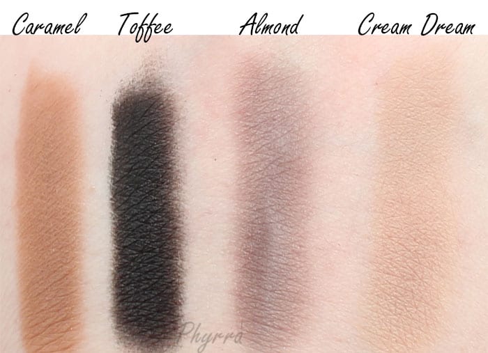 The eyeshadows fall into the following for pigmentation – Snow Flake and Beaming are semi sheer. Almond and Cream Dream are pigmented. Biscotti, Chocolate, Caramel and Toffee are super pigmented. All of the shades are easy to apply, blend well, and wear all day on primer for me. I really like using Snow Flake as a base shade on my browbone or as a matte highlighter. Almond is a gorgeous grey