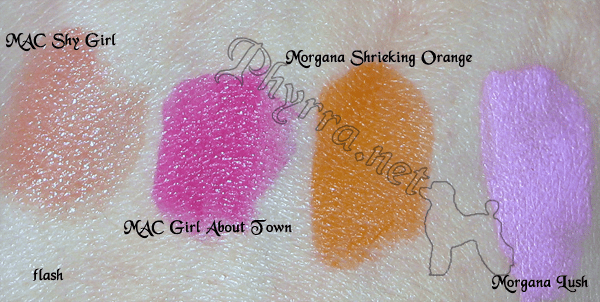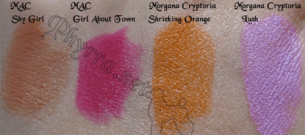 Recently I swatched 4 lipsticks for you. Morgana Cryptoria Shrieking Orange, Morgana Cryptoria Lush, MAC Girl About Town and MAC Shy Girl.