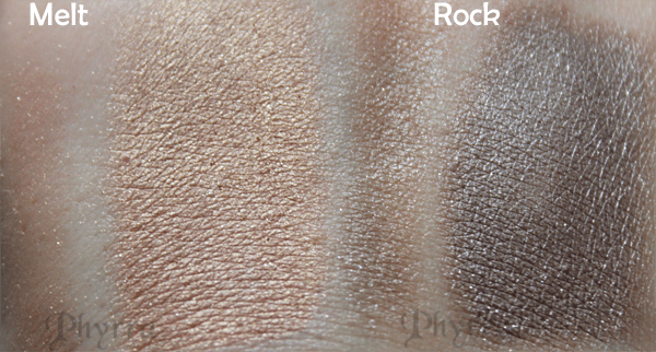 Rock is a very light sandy taupe. Both work well as a sheer wash, or as a lid shade.