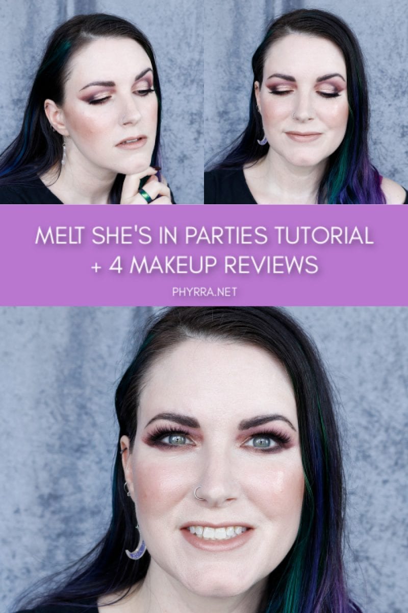 Hey friends, I’ve missed you! I’ve got a Melt She’s in Parties Tutorial to share with you, along with 4 mini-reviews of new makeup products. This wasn’t initially going to be a She’s in Parties palette tutorial, but because of a makeup malfunction, that’s what it turned into. You can absolutely skip using the Stila Kitten Trifecta Metallica in this tutorial if you have hooded eyes like me and just use Melt Skeleton Kiss. The four mini reviews are on the Stila Kitten Trifecta Metallica, Kiss Clear Felt Tip Glue Liner Lash Adhesive, Melt Raw Honey Royal Blush Duo, and Anastasia Beverly Hills Granite Brow Pen.