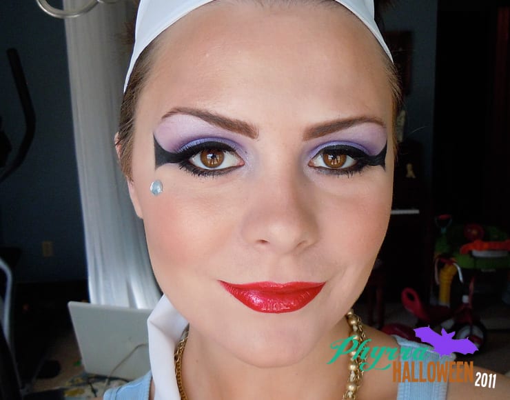 Cleo has a signature diamond below her right eye (I think it’s her right anyway) and getting one to apply is easier than you’d think. I went to my local craft store (Michael’s) and purchased a pack of plastic rhinestones that had already sticky backs. I just popped it off the sheet and placed it on. They are totally sticky enough to last all night. If you can’t find sticky backed rhinestone however, buy some plain plastic ones and then head to your local Halloween shop (you know you have one; ours uses the old Hollywood video store to sell it’s spooky wears) and pick up some spirit glue as well. Spirit glue is a costume/prosthetic glue used in special effects makeup. Its very liquid-y, so let the glue set on the back of the rhinestone for a bit before you place it on your cheek. I’d press it into your skin with your finger for a bit to makeup it dries and holds.