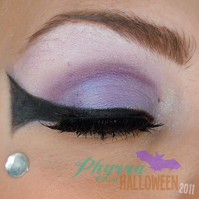 Time to line! First, using a pen eyeliner, make a dot near the end of your eyebrow. I used Hard Candy Cosmetics’ Stroke of Gorgeous Eyeliner in ‘Little Black Dress.’ A few centimeters below it, make another dot. It should look like the dots in the picture above. Then, starting at the inner corner of your eye, start lining your eyes, bringing the line up a little the further you move towards the outer corner. When you reach that edge, connect the to the dot with a slightly curved line. Connect the two dots together then with another curved line (this one curving up rather than down) connect the second dot to the outer corner of your eye. Finish up line but brining it under your lash line and connecting it to the inner corner of your eye. Now it’s time to fill. First fill in the triangle you created at the outer part of your eye, then go over the other liner again to make it darker. Next, using an angled brush, apply a matte black shadow over top the liner. This will make the liner last longer and even out the color. You can also use the black eyeshadow and angled brush to sharpen up any edges of the triangle. I came back and went over the curved lines that connect the shape to my eye to make them more crisp. If you’ve messed up, don’t worry. Dip a cotton swab into some makeup remover and use it like an eraser over any mistake. Then you can just reapply whatever color your took away.